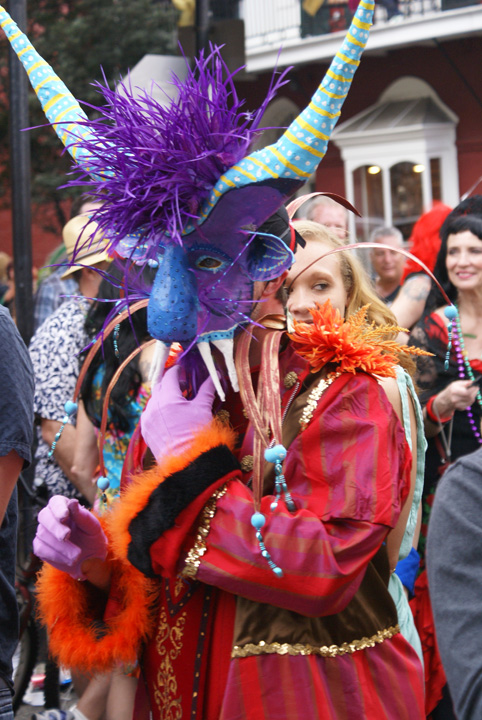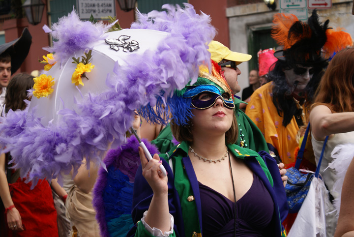 For me, the best part of Mardi Gras Day has always been the people watching. The rest of the weekend is for partying, but the last and biggest day of the season is generally more about checking out the crowd than being part of it. I love the colors, sparkles, and smiles that abound in the city during the daylight hours of Fat Tuesday. The Man and I rolled out of bed at 9am and got costumed up, then rode our bikes down to the French Quarter to take photos before things got too rowdy, as they tend to by mid afternoon. Here are a few of my favorite faces from around the Quarter and Marigny.