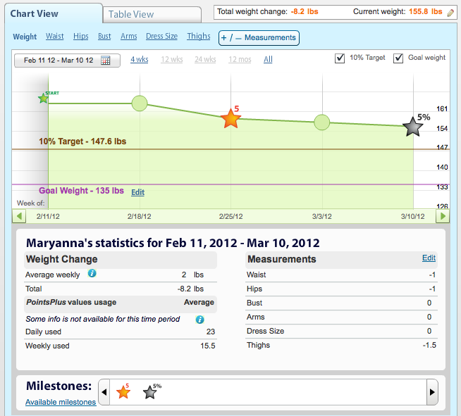 The official verdict is in – GNC Total Lean Shakes work, especially when combined with the Weight Watchers PointsPlus program. Even though I’ve been slacking off since I finished the 7 Day Fast Loss Kit, have not exercised, and have eaten pretty much what I wanted (within reason), I’ve tried to stick to replacing at least one meal a day with a shake, and for the last couple of days I’ve replaced two meals with a shake. I could probably be seeing much more drastic results if I just got my butt off of the couch once in awhile, but even so, I’m still seeing changes. Since Mardi Gras I’ve lost 8.2 lbs, an inch off of my waist and hips, and an inch and a half off of my thighs. In the interest of remaining true to my reporting goal while avoiding boring the ever-loving shit out of you, here’s a snapshot of my Weight Watchers chart.