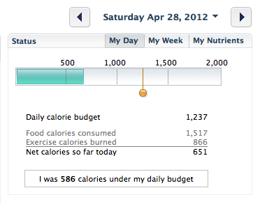 I’ve been using Lose It! to count everything I eat and do, and have found that it’s on point. The calories are counted on a little bar that shows when you’re approaching your limit for the day (which is set to allow you to lose weight by staying under a certain level, depending on your personal goals, height & weight). Calories are added as you eat, and then if you exercise, the calories are taken away. There’s also a little counter that tells you exactly how many calories you can still eat and stay in the right range. It looks like this: