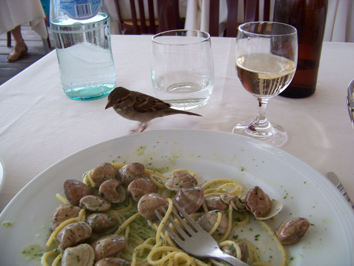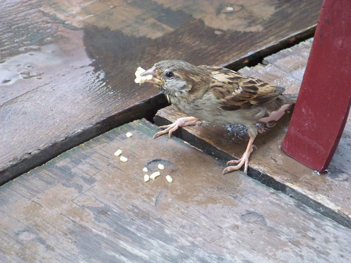 I was so happy throughout the meal, and while I was finishing up, this tiny, very bold sparrow flew down, perched on my plate, and ate a noodle! I guess it could tell I was amused, or else it was used to getting its way, so it came back a few times to snatch more noodles and some bread crumbs. I couldn’t believe how much it was able to eat.