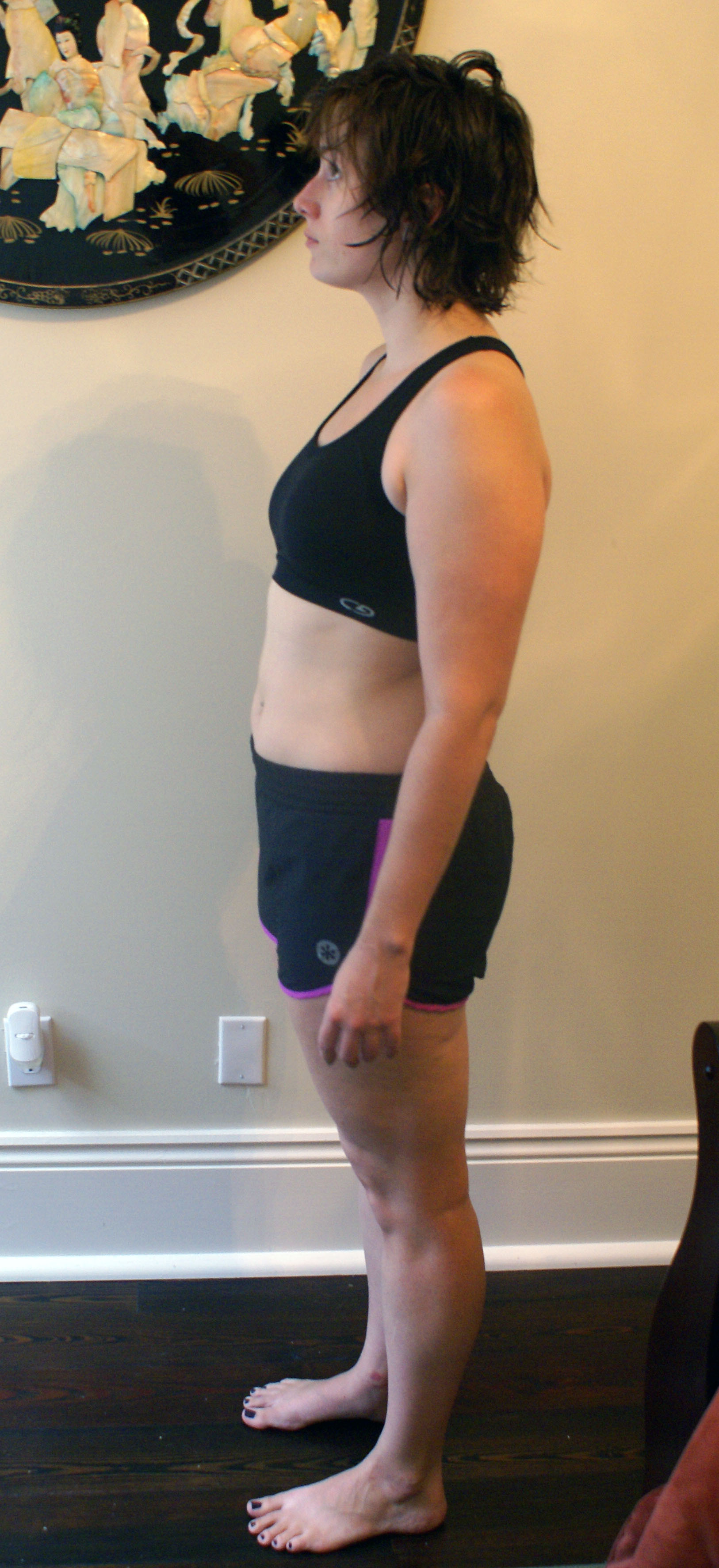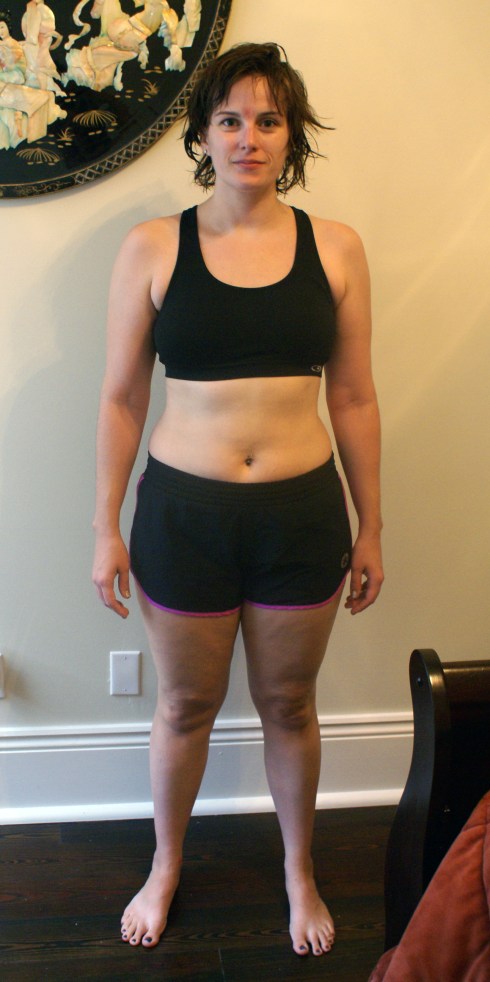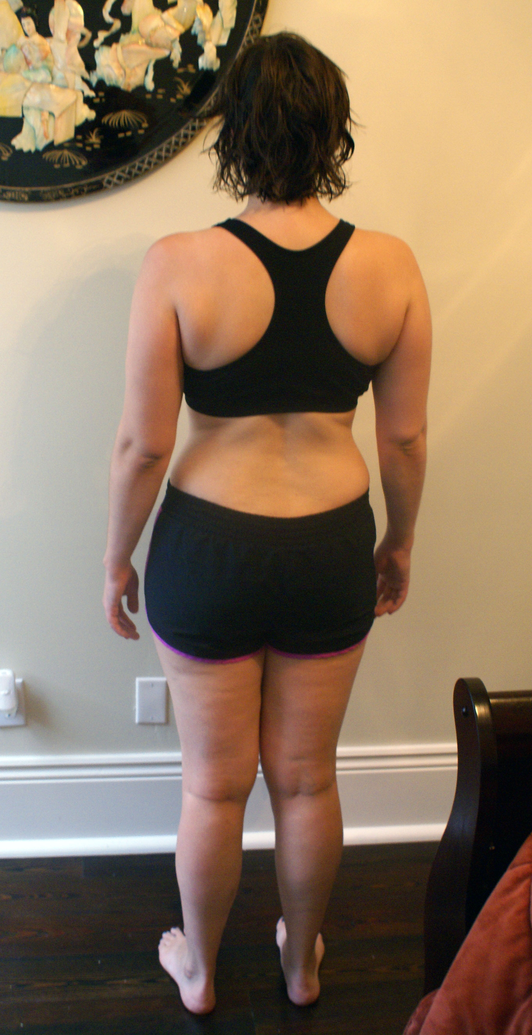 I promised that I’d post pics of my ‘before’ self, in order to hold myself accountable. The Man snapped these for me yesterday, and honestly I look a lot worse in these than I thought I did. The cellulite, saggy arms, and back fat are definitely eye-openers. Forgive the crazy hair – I had just gotten out of the shower.