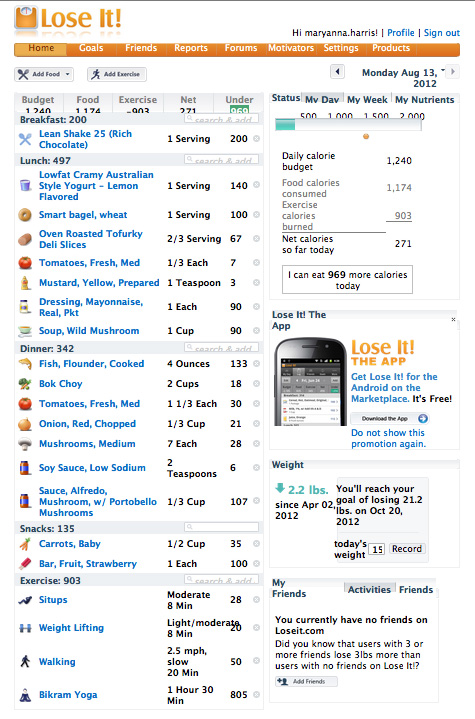 Y’all will have to excuse me, ’cause I’m gettin’ ready to hit the hay. Here’s my day according to LoseIt – let’s hope tomorrow morning puts me at somewhere in the 158 realm…