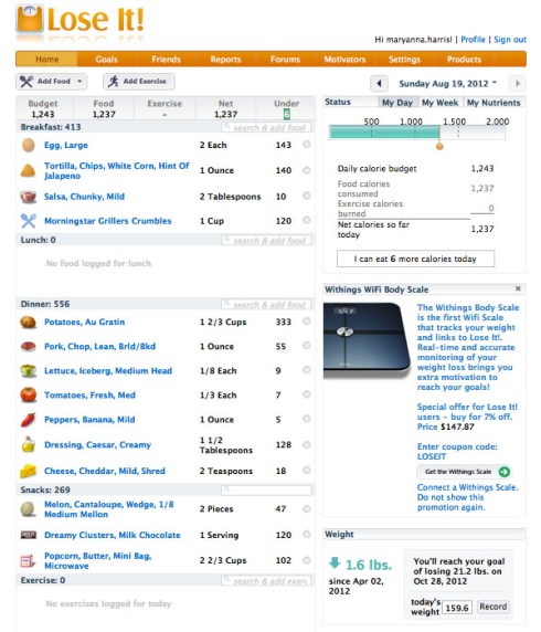 Here’s my food for the day. The Man made pork chops for dinner. I hate pork chops, but I always give it a try when he cooks, just to be supportive. Sure enough, I could only eat a few bites. It’s better that way – I stayed just under my calorie allotment for the day.