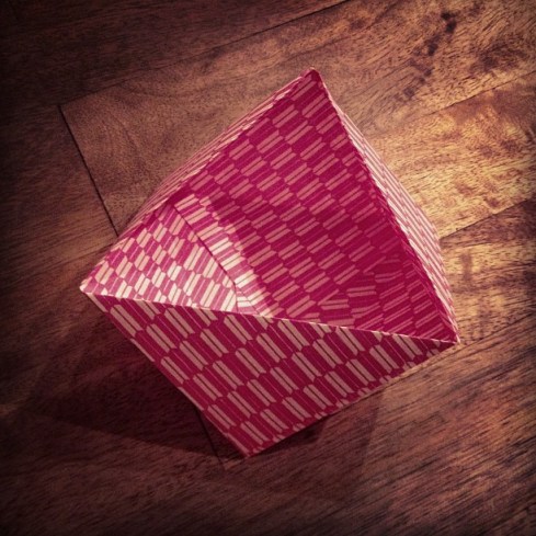 My new origami paper came in today, and I just couldn’t help myself; I had to try a project as soon as I got home from yoga. Here’s my creation, a triangle box that requires three sheets of paper and very little know-how. This is my first attempt at a triangle box ever, and I’m pretty proud that it looks the way it did in the instructions. My only “upgrade” was a little bit of glue from a glue stick at the bottom layers, just to make it a bit more sturdy for holding whatever it is you end up putting in an origami box. If you’d like to make your own, click here for a step-by-step diagram.