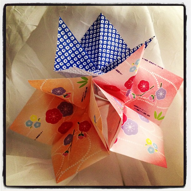 I’m honestly a little ashamed of today’s entry into the Thirty Days Project. These origami blossoms were easy to make, taking about five minutes in all, but they’re also pretty boring. I started off trying to make a crane early this morning, since I’d read that they’re very simple (more of a kid’s project). After 45 minutes and two failed attempts, I gave up. I was already at work, wasting time, so I hurried to do more productive things, only going back to my origami attempts about an hour ago. Since I’ve got a long evening of writing ahead, and a pretty big project on my hands at work, I thought it would be best to just go simple. The one good thing about these little flowers is that I had a few sheets of paper left over from failed attempts at my vase yesterday, so I just ignored the existing creases and used those pieces of paper to make the blossoms.