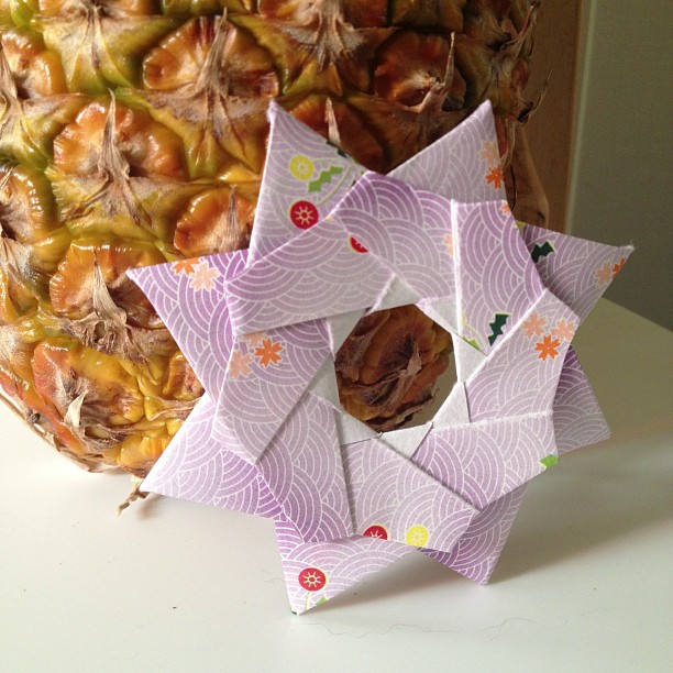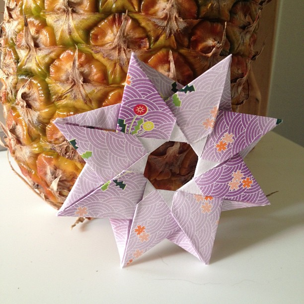 This one isn’t hard – just time consuming. It’s a modular star shape designed by Maria Sinayskaya. It requires 8 small squares of paper, so I used two 6″ x 6″ pieces of paper, cut into quarters. I’m actually considering folding up a bunch of pretty Christmas ornaments in this shape for the holidays. Here’s a video that shows how to do it.