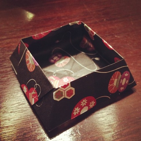 I’ll make this short, since it’s after midnight and way past time for me to go to bed. Today I tried to make a stupid origami rabbit, only to screw up the same easy reverse fold on multiple attempts. Finally, in a fit of pique, I gave up and looked up another diagram. So glad I did, because this cute little candy dish was easy and definitely something I can see myself folding again for a friend. I have a feeling a lot of people are going to be getting origami presents this Yule time. Here’s the candy dish diagram if you’d like to try it yourself.