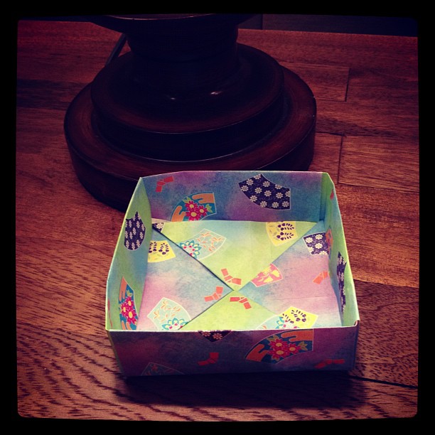 Yesterday’s project was taken from Tomoko Fuse’s book “Joyful Origami Boxes,” and let me tell you now that the process of making these was slightly less than joyful. It was more in the range of extremely irritating, actually. I’ll complain more later, though – too busy today.
