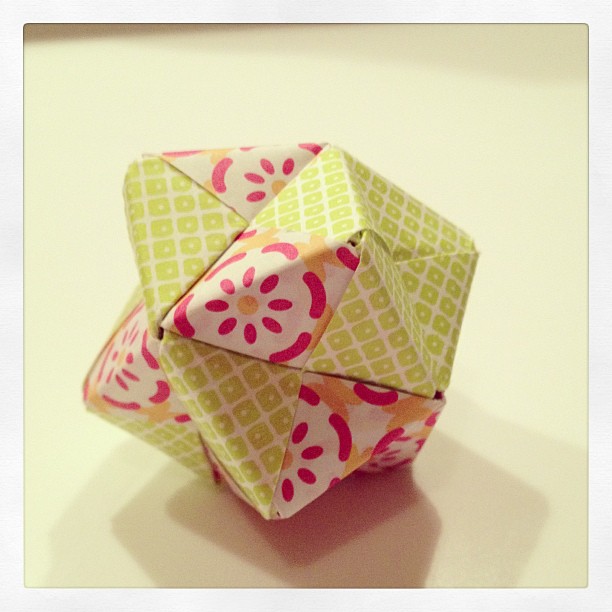 Hallelujah, I’m finally caught up! I wanted to choose something moderately easy, since I’ve got a lot of tasks to accomplish tonight. So around two hours ago, I sat down to make a 12 module origami ball (using instructions from A Fine Tangle) that should have taken around 10 minutes to make.