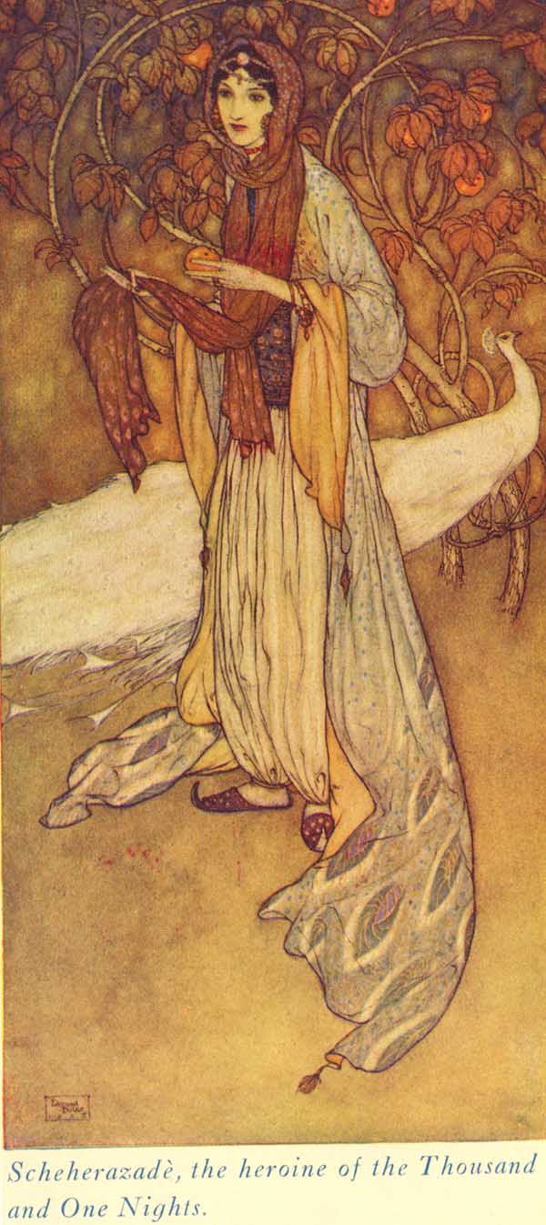 This is Scheherazade, an illustration from The Arabian Nights, by artist Kay Nielsen. It was never published in conjunction with the book, but only later, in its own collection after his death. I first saw his work in a beautiful hardbound copy of In Powder and Crinoline, a gift from my Grandma & Grandpa, my mother’s parents, at some point in junior high. You might notice that this style of illustration is different from more typical fairy tale illustrations of the time. For comparison, here are illustrations by two of my other favorite illustrators, Edmund Dulac: