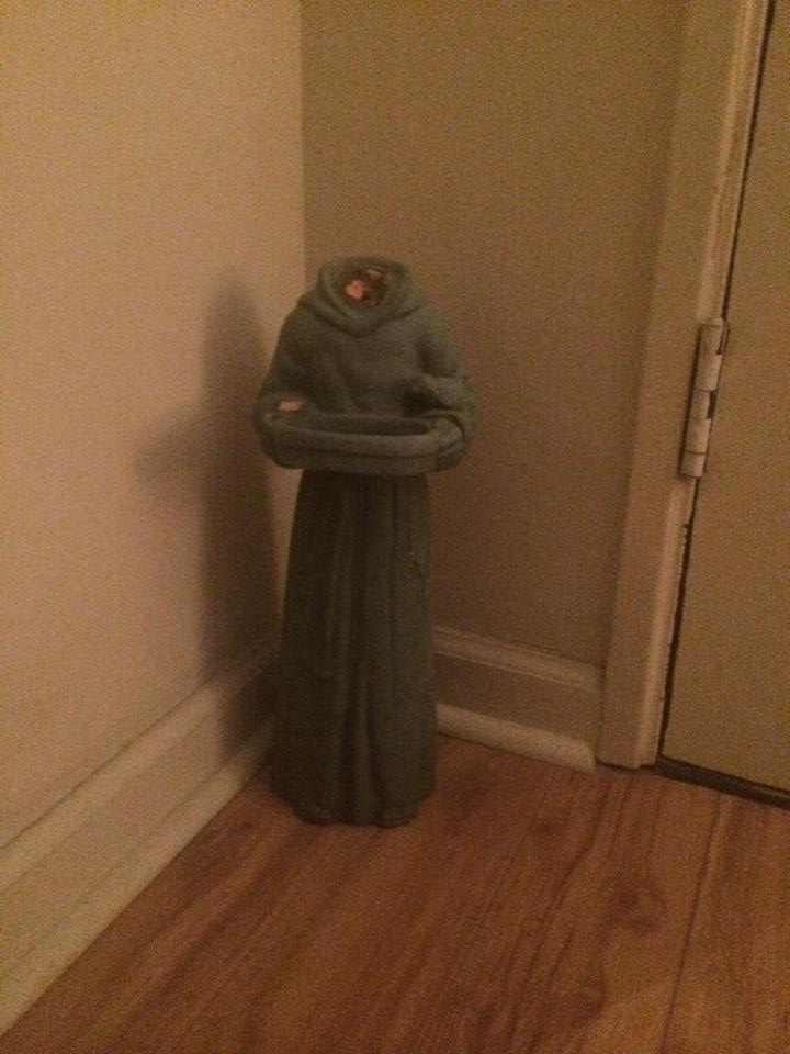 This being the case, when I happened upon a statue of Francis in someone’s trash pile last week, I was so excited to take him home. It was a pretty weird find, because my boyfriend and I had set out that afternoon to find something (I wasn’t sure what) to go beside my front door for decoration. I’d had this idea that it would be a statue, but all day while we were shopping, nothing was catching my eye. We’d given up and were actually heading back home when we passed the trash pile and I spied Francis sitting there, waiting to be rescued.