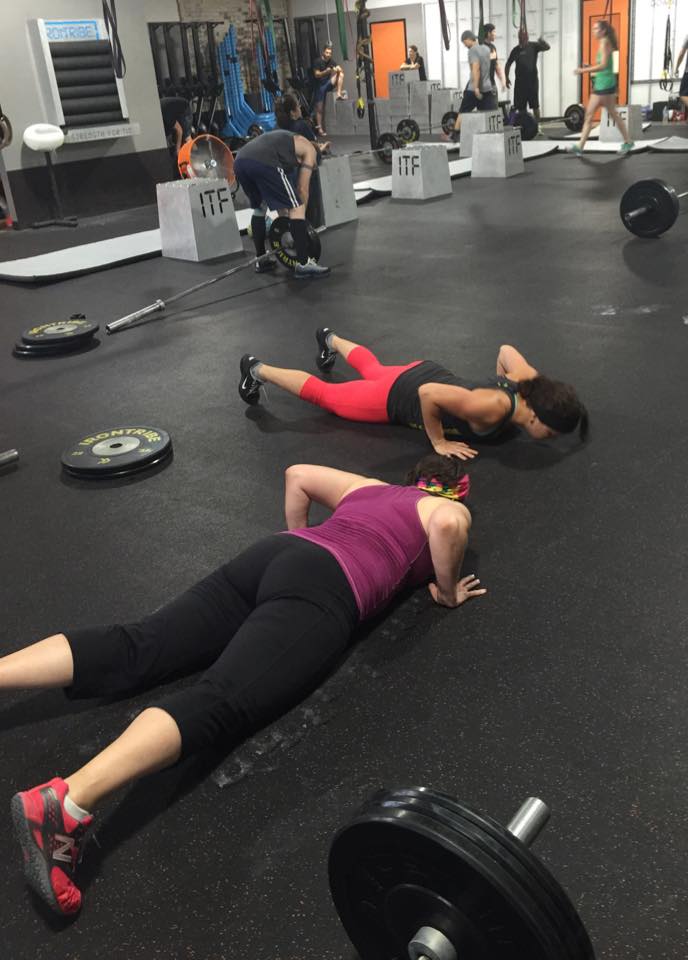 Tuesday’s workout was better, but for a different reason: I had three personal firsts that were directly related to being stronger, all in the same workout. First off, we had to open and close the workout with 15 burpees. I typically try a couple of regulation burpees, then get worn out and do a scaled version where you step up instead of jump up. I got through NINE in the opening round, which is huge for me. Here’s a pic of me doing burpees at the end of the workout (22 minutes to do 15 burpees, 5 rounds of 6 pull ups and 6 deadlifts, 15 more burpees – I finished in 16:52), with my coach, Shelby, beside me helping me through those last few reps. Doesn’t she have the most amazing arms? I’m asking Santa for two of those this Christmas 😀